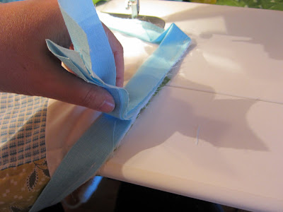 I followed the lines of the sashing for my quilting inspiration, creating a larger triangle pattern. I used a yard stick, also from my local hardware store, and tailor's chalk to draw my quilting lines. Making the Binding